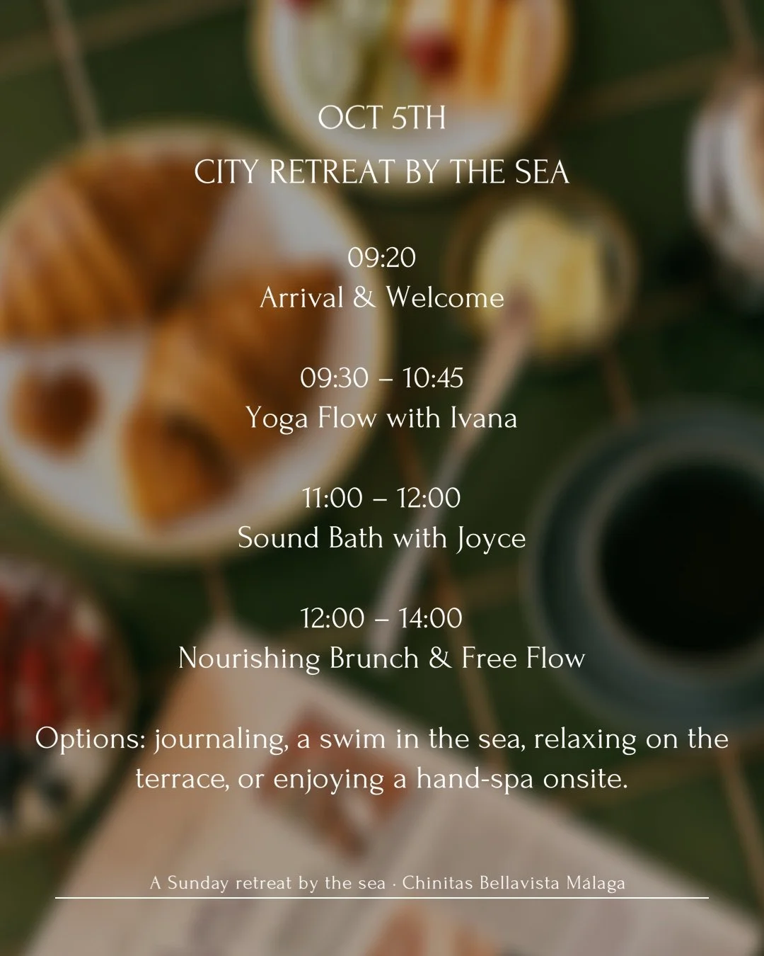 Categories: All Sound Healing Wine & Foodie Event All / Oct. 26 Sunday- Beach Sounbath & Aroma, Malaga Sale Price: €19.00 Original Price: €25.00 Sale Oct. 5 Sunday – City Retreat by the Sea €65.00 Sold Out Sept. 21 Sunday– New Moon Soundbath by the sea Sale Price: €0.00 Original Price: €25.00 Sold Out 🌿 August 31 Sunday · Soundbath & Aroma · Realign & Return €35.00 Sold Out Sound Healing & Aroma Journey – July 27, Málaga €30.00 Sold Out Sound Healing & Aroma Journey – June 29, Málaga €30.00 Sold Out A Journey Through Multi-Sensory: Sound & Aroma & Chakra Healing-Malaga Sale Price: €20.00 Original Price: €35.00 Sold Out